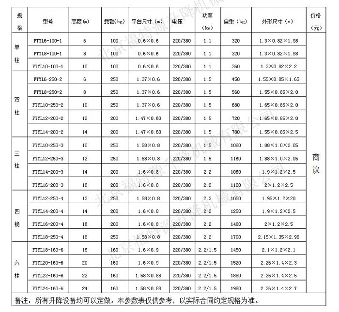 ▍鋁合金升降機常規參數 / Product Parameter